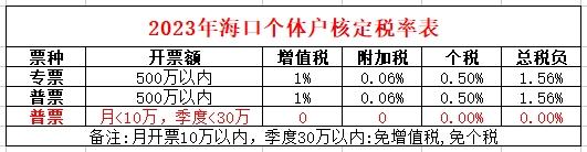 另外,海南2023年个体核定征收一季度开30万,一年开120万,双免不用交税;年开票120-450万之间,总税率1.56%。