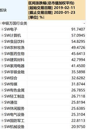 从28个申万一级行业表现来看,近乎满盘皆红。26个行业全面收涨,仅有建筑装饰、采掘、钢铁3个行业区间收跌。而从涨幅来看,电子、计算机、食品饮料、农林牧渔、医药生物、建筑材料等7个行业涨幅超40%,其中最猛的电子行业,猪年涨幅竟然超出91%。