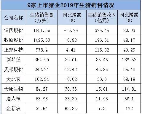 据不完全统计显示,截至目前有9家上市猪企披露2019年生猪销售简报,公开了2019年全年的生猪销售量和销售收入。