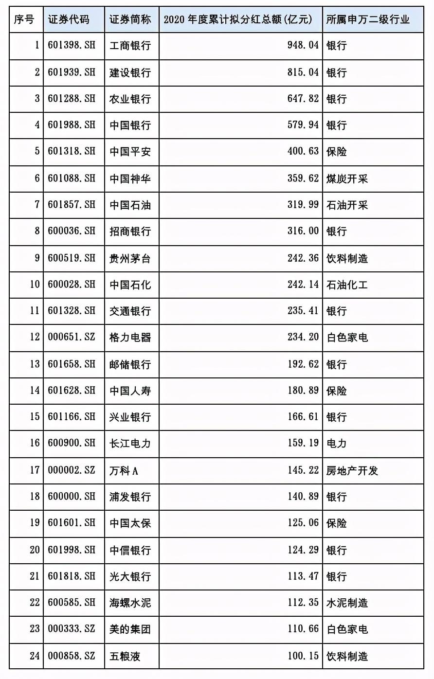 表2:A股市场2020年拟分红总额超百亿的24家公司 数据来源:《财经》记者根据wind数据整理