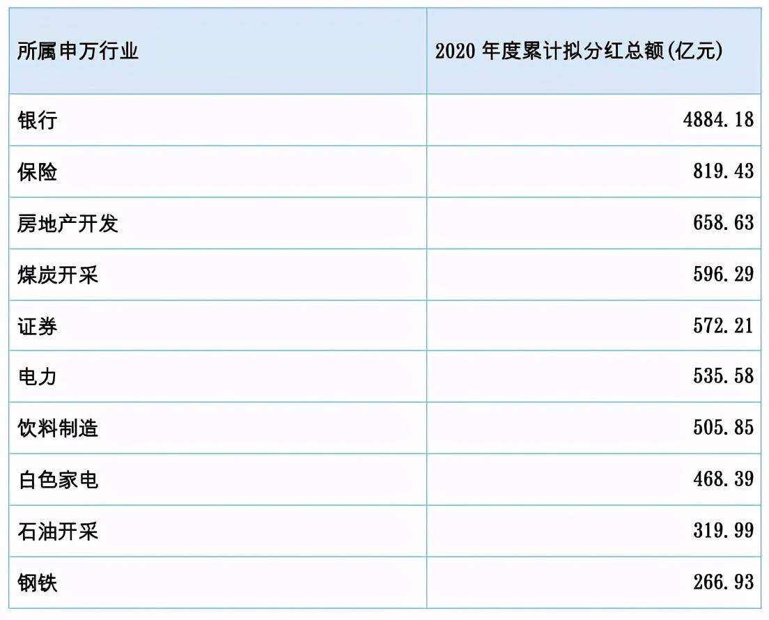 表1:A股市场2020年拟分红总额行业前十 数据来源:《财经》记者根据wind数据整理