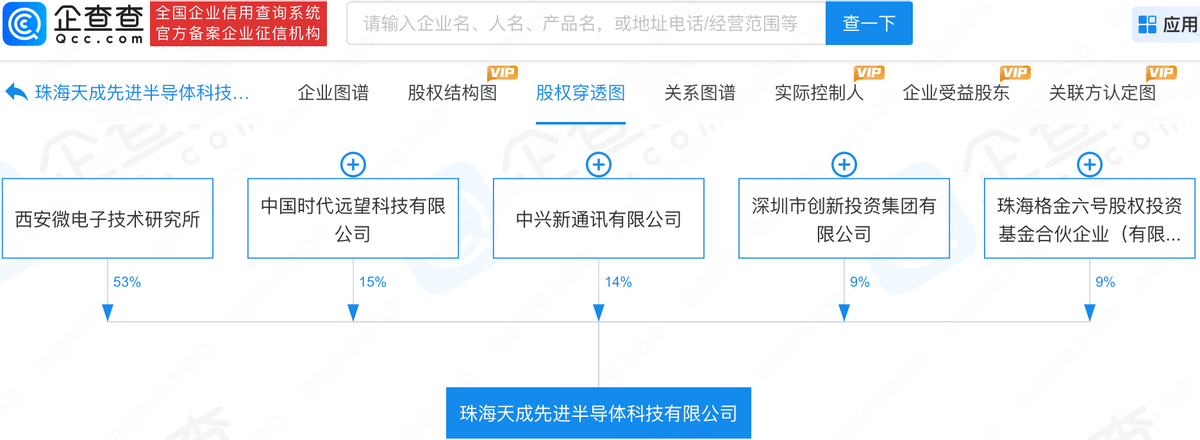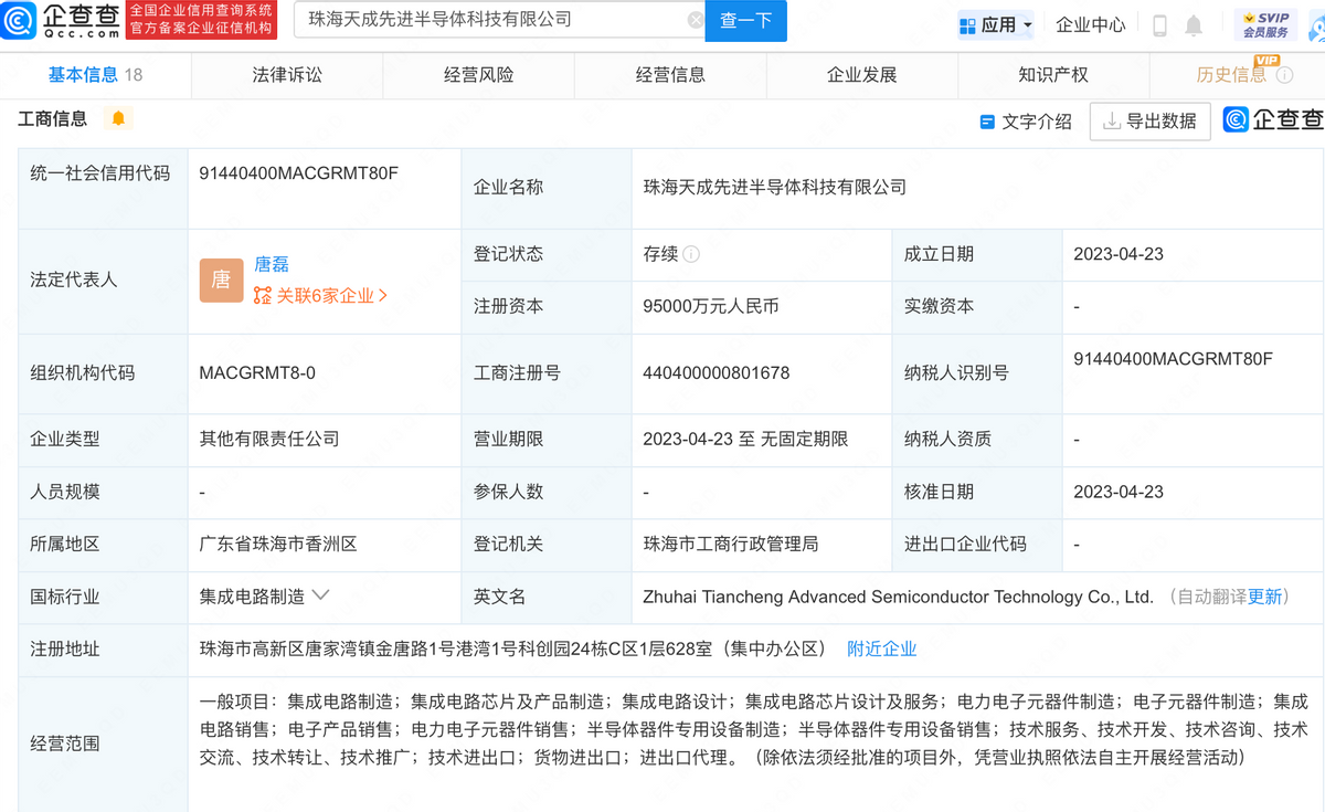 珠海天成先进半导体科技有限公司成立,注册资本为9.5亿元人民币