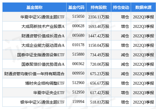 其中持有数量最多的基金为华夏中证5G通信主题ETF,目前规模为80.14亿元,最新净值0.8163(1月5日),较上一交易日上涨2.46%,近一年下跌33.61%。该基金现任基金经理为李俊。