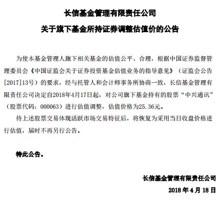 同样选择大幅下调估值的还有长信基金,根据长信基金发布的公告:为使本基金管理人旗下相关基金的估值公平、合理,根据中国证券监督管理委员会《中国证监会关于证券投资基金估值业务的指导意见》(证监会公告[2017]13号)的要求,经与托管人和会计师事务所协商一致,长信基金管理有限责任公司决定自2018年4月17日起,对公司旗下基金持有的股票“中兴通讯”(股票代码:000063)进行估值调整,估值价格为25.36元。