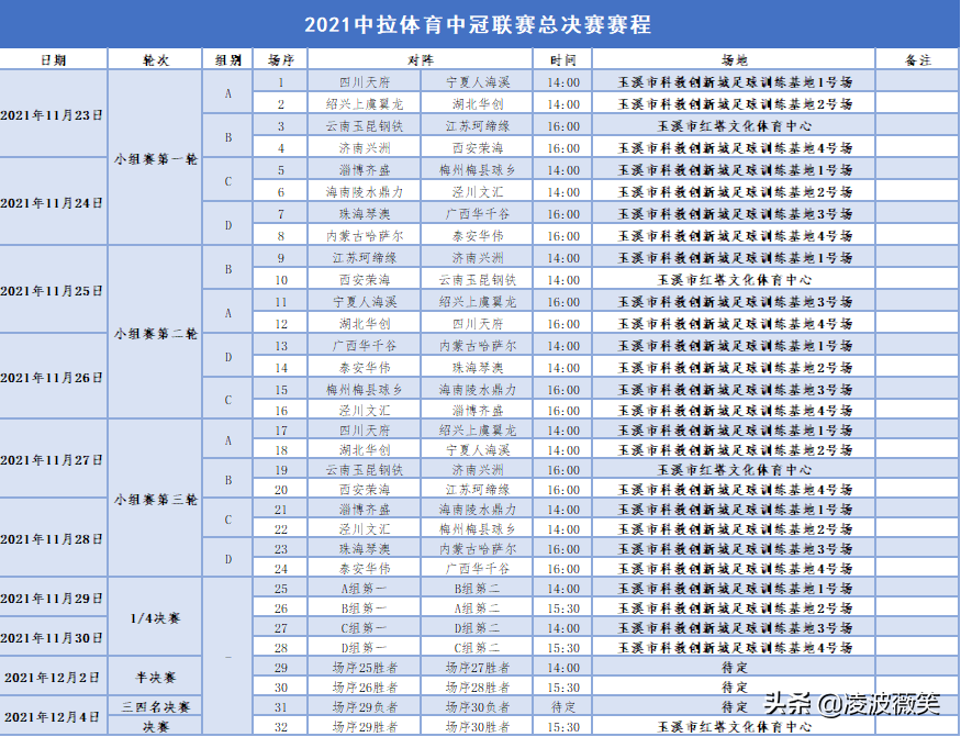 D组首轮将在11月24日16:00进行,由珠海琴澳迎战广西华千谷,内蒙古哈萨尔迎战泰安华伟。从中可以看出,两大前国脚肖战波与刘金东执教的球队,首轮就将上演激情对话。