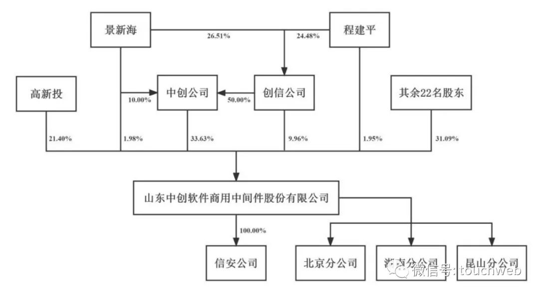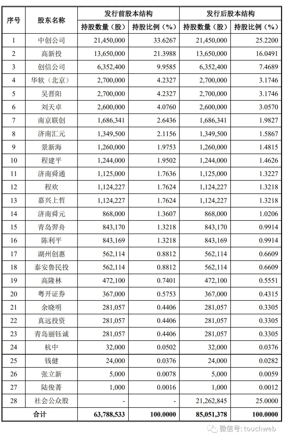 IPO后,中创公司持股为25.22%,高新投持股为16.0491%,创信公司持股为7.4689%,华软(北京)、吴晋阳分别持股为3.1746%,刘天卓持股为3.057%,南京联创持股为1.9827%,济南汇元持股为1.5867%;