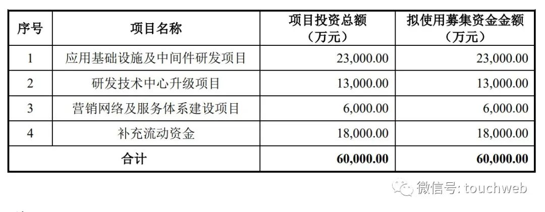 中创软件计划募资6亿元,其中,2.3亿元用于应用基础设施及中间件研发项目,1.3亿元用于研发技术中心升级项目,6000万用于营销网络及服务体系建设项目,1.8亿元用于补充流动资金。