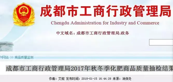 成都市工商局2017年第3、4季度在龙泉驿区、青白江区、新都区、崇州市、都江堰市、彭州市、邛崃市、金堂县大邑县、新津县、蒲江县等区域内的集贸综合市场、专业市场、农资商店等流通领域,开展了化肥质量抽检。本次抽检委托四川省危险化学品质量监督检验所承检。