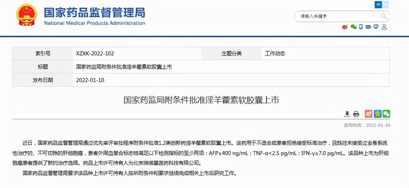 上市,可用于治疗不适合或患者拒绝接受标准治疗,且既往未接受过全身系统性治疗的、不可切除的肝细胞癌,而淫羊藿正是中医常用的一款中药,这件事引起了热议。