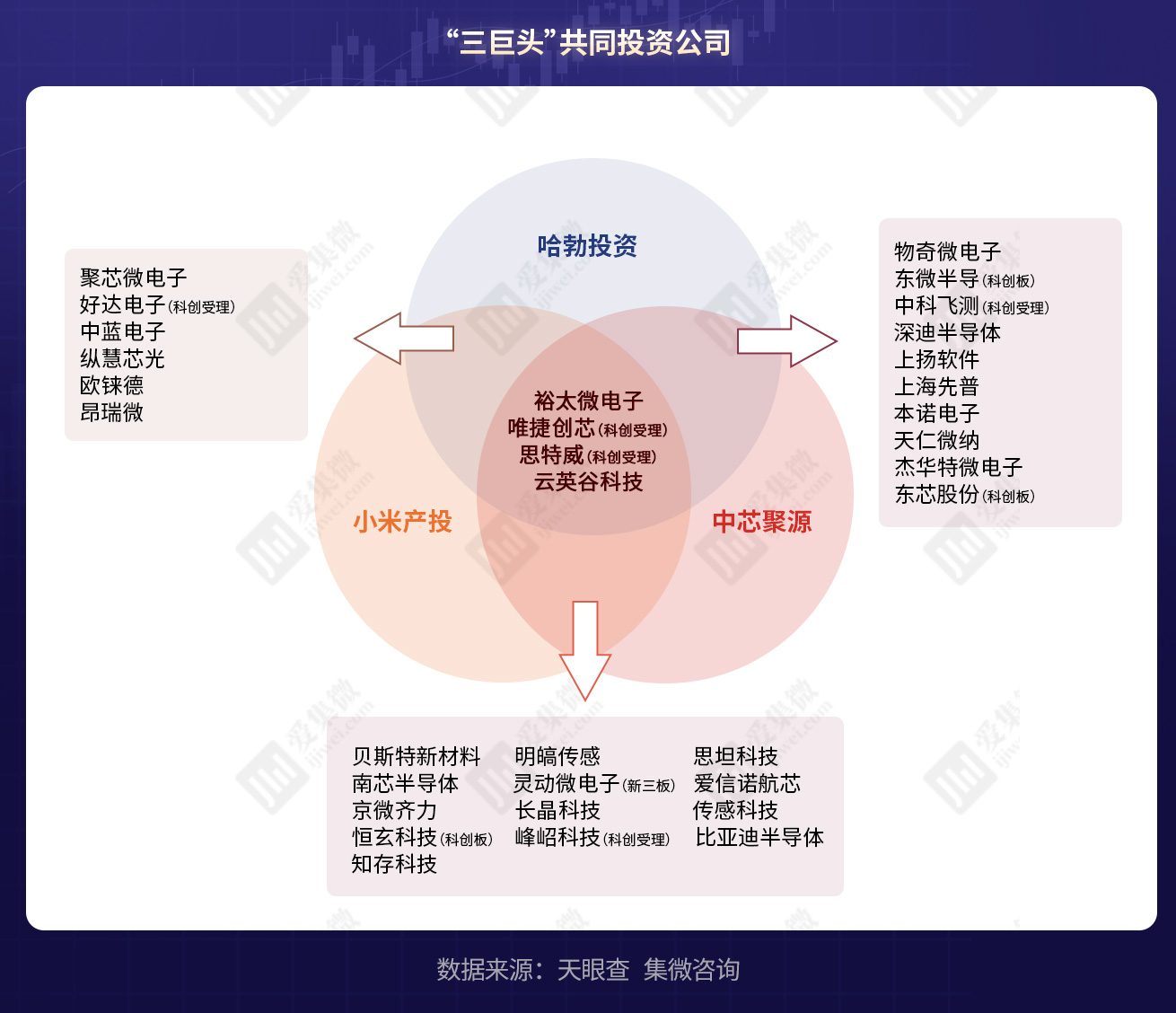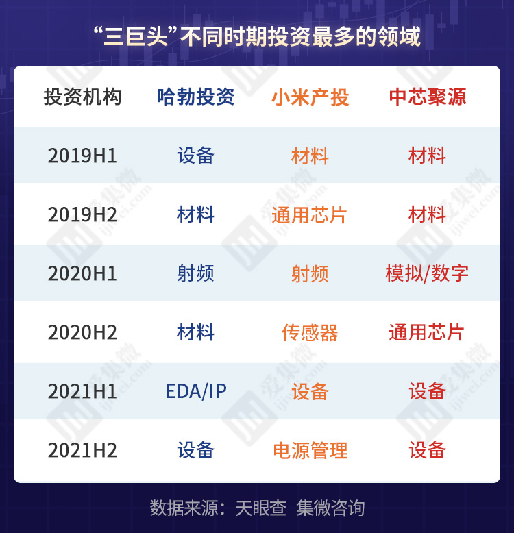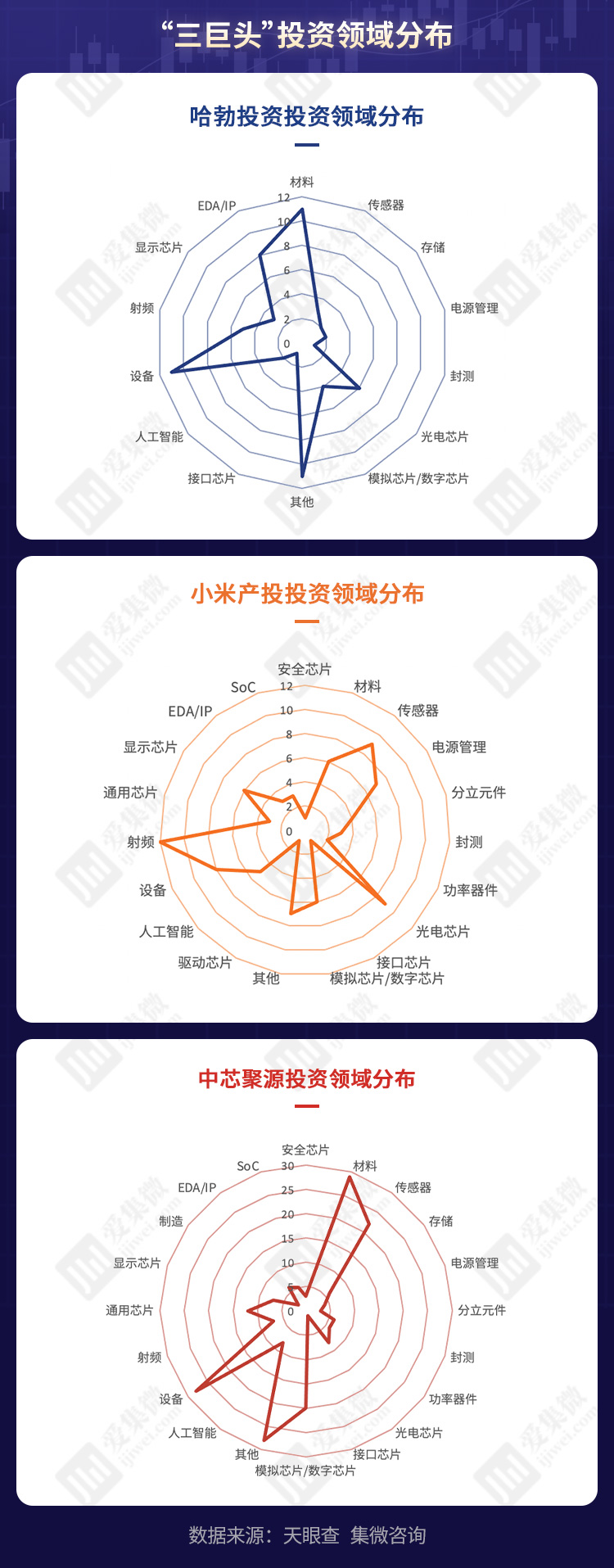 三家机构在投资赛道上也有所不同,哈勃投资侧重于材料、设备和EDA/IP,小米产投侧重于射频、传感器和光电芯片,中芯聚源侧重于材料、设备和传感器。