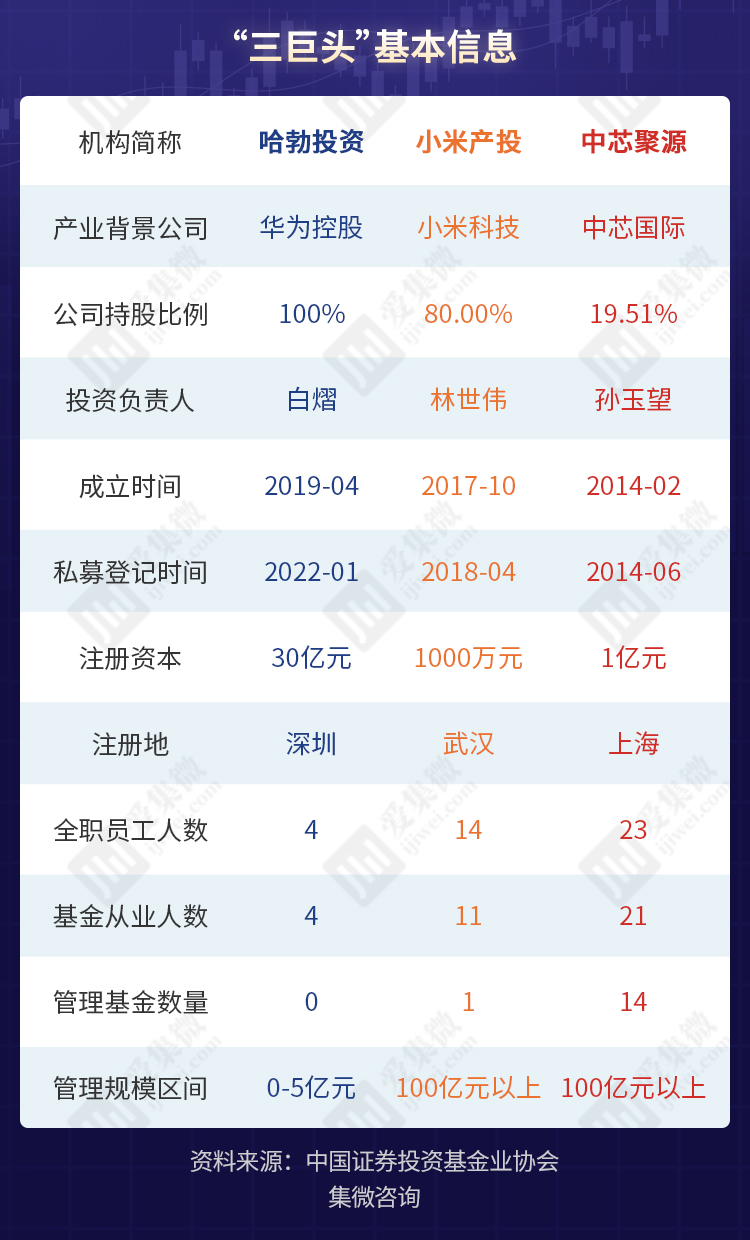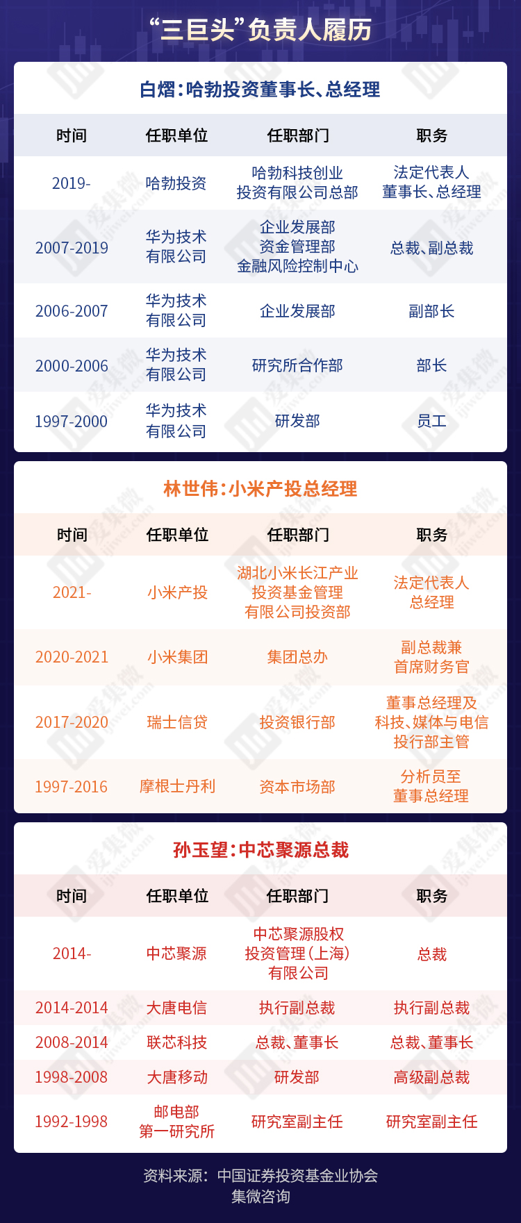 从三家机构负责人的履历来看,特点鲜明,哈勃投资总经理白熠早期即是华为公司的技术人员,逐渐开始转向金融投资领域;小米产投总经理林世伟有着丰富华尔街经验和国际视野;中芯聚源总经理孙玉望则是研究所出身,历任大唐移动、联芯科技、大唐电信等企业管理人员,后开始担任中芯聚源负责人。