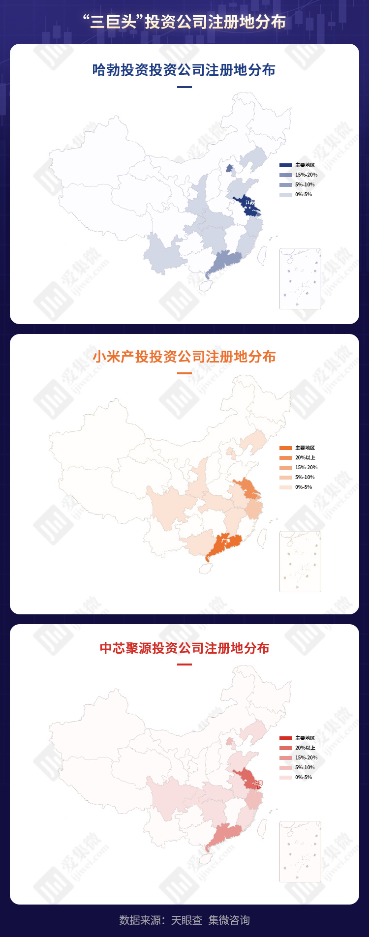 从被投资公司的注册地来看,三家机构基本一致,都重点在长三角及珠三角经济圈布局,略有不同的是,哈勃投资被投公司最多的地方是江苏,小米产投是广东,中芯聚源则是上海。
