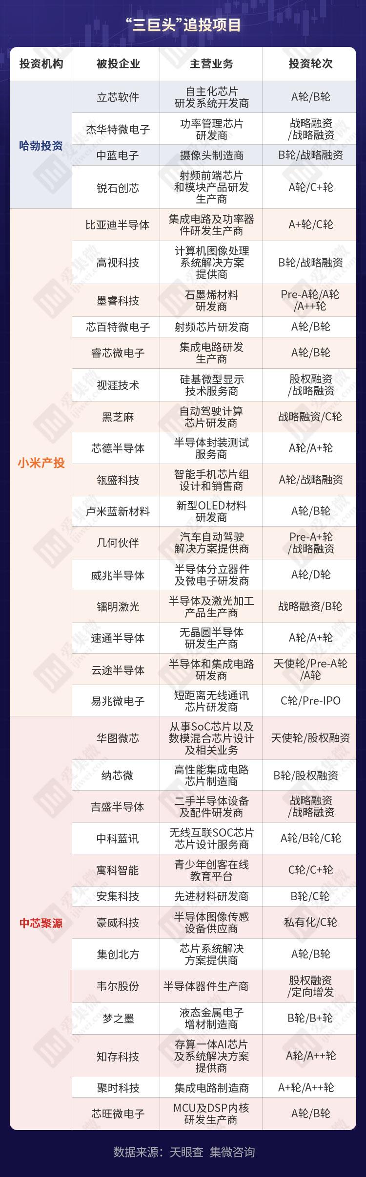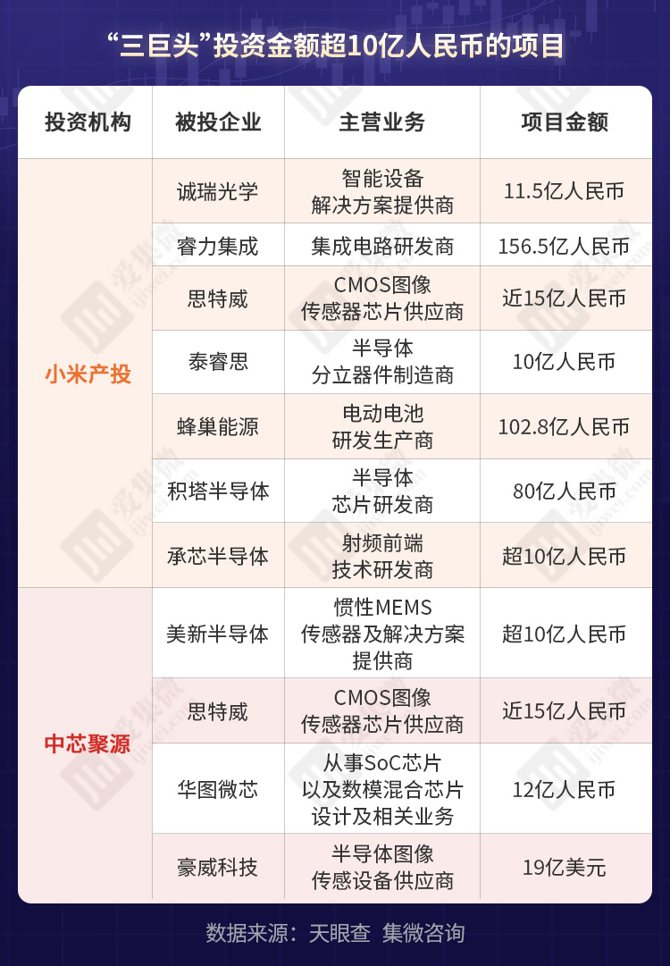 值得一提的是,超过百亿的投资项目分别是小米产投参与的睿力集成、蜂巢能源和中芯聚源参与的豪威科技。