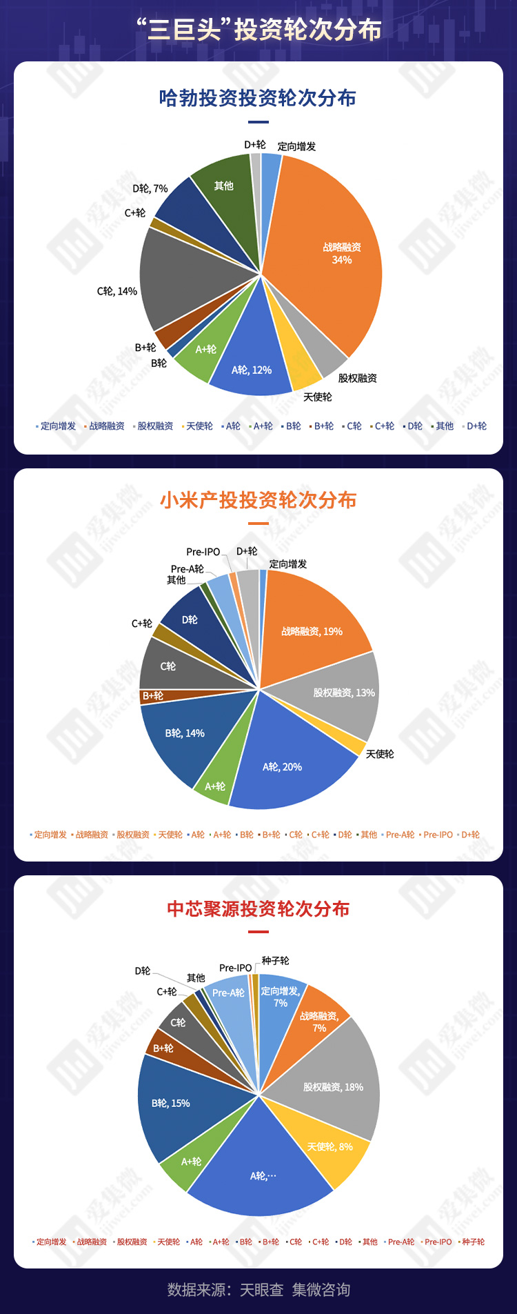 同时,三家机构各自又有所不同,哈勃投资战略融资轮次占比最多,达34%,其次是C轮融资和A轮融资,占比分比为14%和12%;小米产投A轮融资占比最多,达20%,其次为战略融资和B轮融资,占比分别为19%和14%;中芯聚源A轮融资占比最多,达21%,其次为股权融资和B轮融资,占比分别为18%和15%。