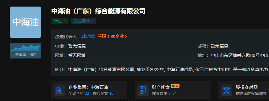 8月30日,天眼查显示,近日,中海油(广东)综合能源有限公司成立,法定代表人为龚晓晓,注册资本20亿人民币,经营范围包括碳减排、碳转化、碳捕捉、碳封存技术研发;生物质能技术服务;资源再生利用技术研发;太阳能发电技术服务等。股权穿透图显示,该公司由中国海洋石油有限公司间接全资控股。