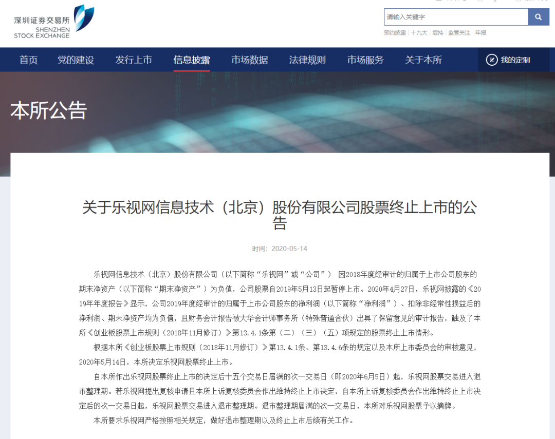 5月14日,据深交所网站消息,深交所今日发布《关于乐视网信息技术(北京)股份有限公司股票终止上市的公告》称,乐视网股票终止上市。