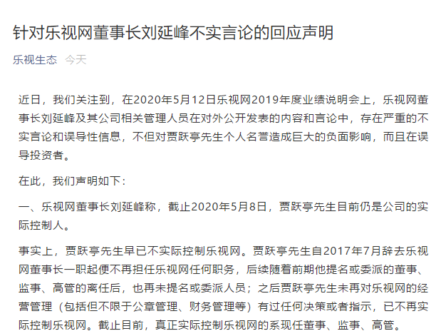 不过,5月14日上午,乐视控股官方微信“乐视生态”就表示,贾跃亭早已不是乐视网的实际控制人。乐视控股的理由是,贾跃亭自2017年7月辞去乐视网董事长一职起便不再担任乐视网任何职务,后续随着前期他提名或委派的董事、监事、高管的离任后,也再未提名或委派人员;之后贾跃亭先生未再对乐视网的经营管理(包括但不限于公章管理、财务管理等)有过任何决策或者指示,已不再实际控制乐视网。截止目前,真正实际控制乐视网的系现任董事、监事、高管。