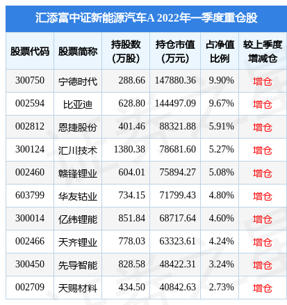 汇添富中证新能源汽车A的前十大重仓股如下: