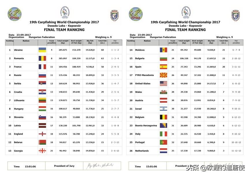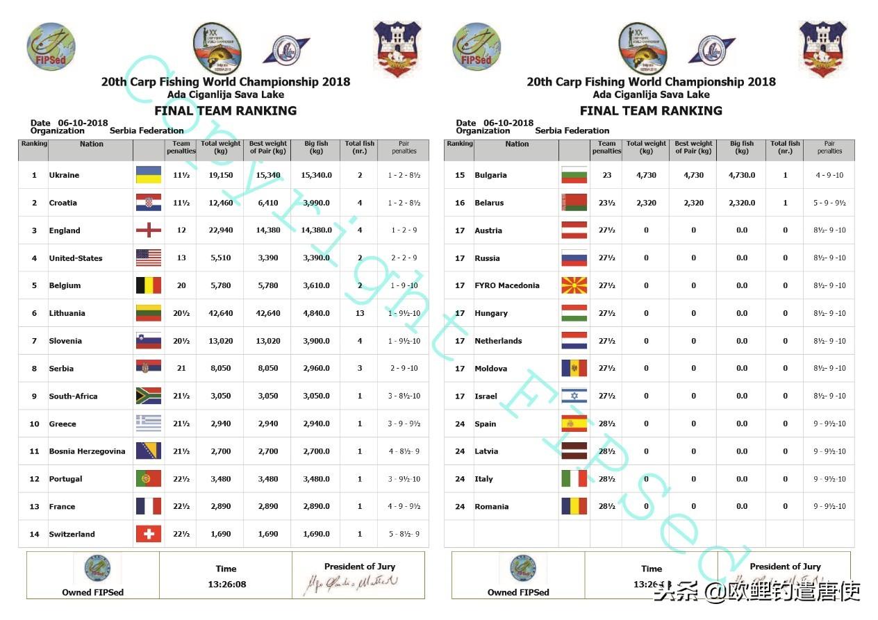 第20界CWC欧鲤钓世界锦标赛各国家队比赛成绩如下: