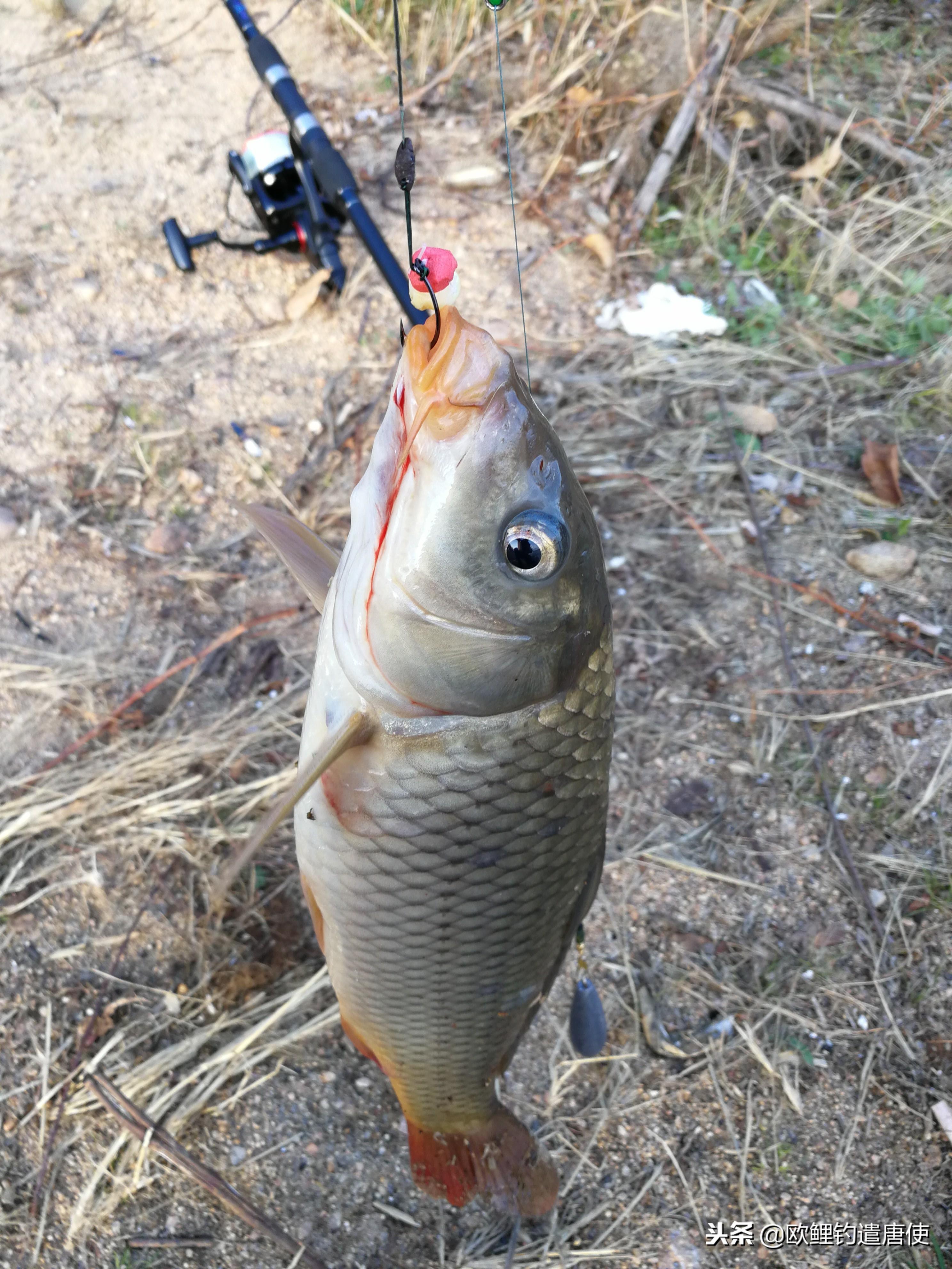 本使用6号欧鲤钩的马头钓组野钓钓获的1斤重小鲤鱼: