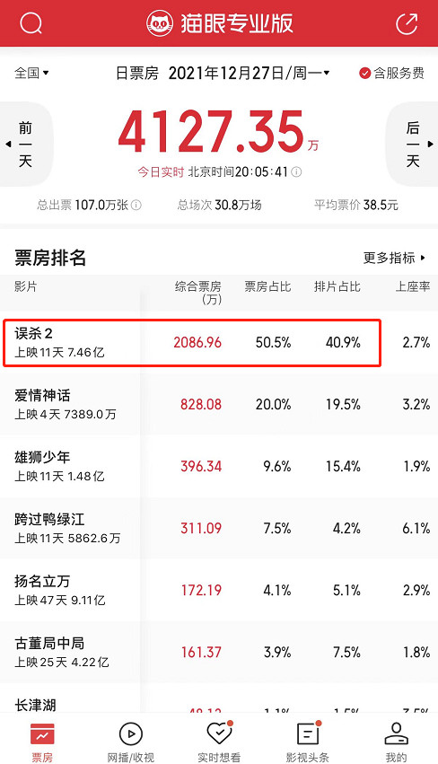 《误杀2》无疑是一匹黑马。猫眼专业版显示,截至12月27日晚8点,《误杀2》上映11天累计票房为7.46亿元,远超同期上映的《雄狮少年》、《跨过鸭绿江》,且实时票房占比、排片占比均位列榜首。