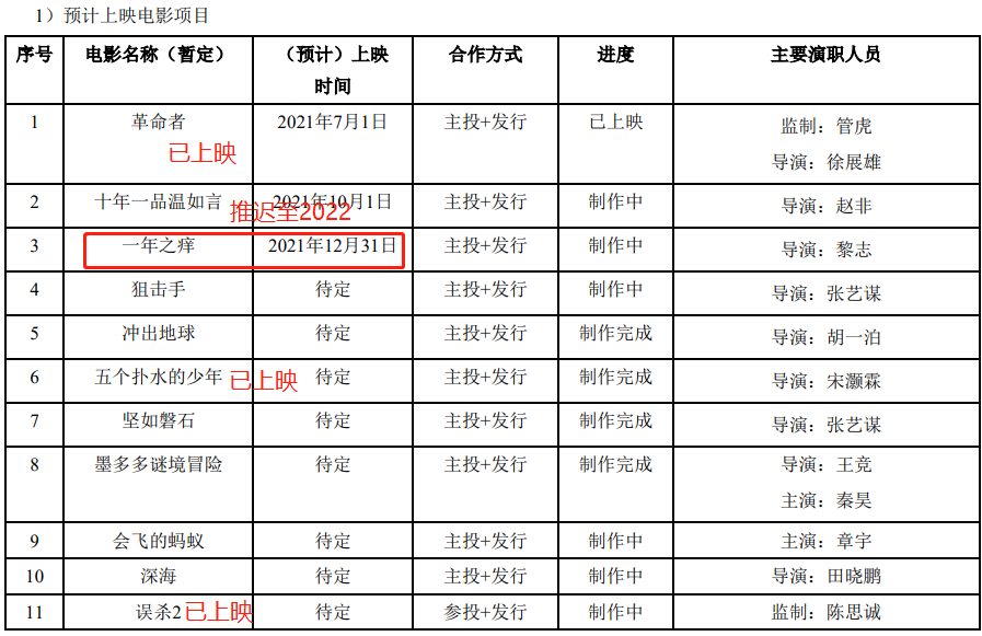 光线传媒曾在半年报中披露预计上映的电影项目。结合猫眼、淘票票信息,今年四季度公司仅有《五个扑水少年》、《误杀2》、《一年之痒》三部电影上映。《革命者》累计票房为1.36亿元;而《一年之痒》年末上映,可为2021年贡献的营收有限。