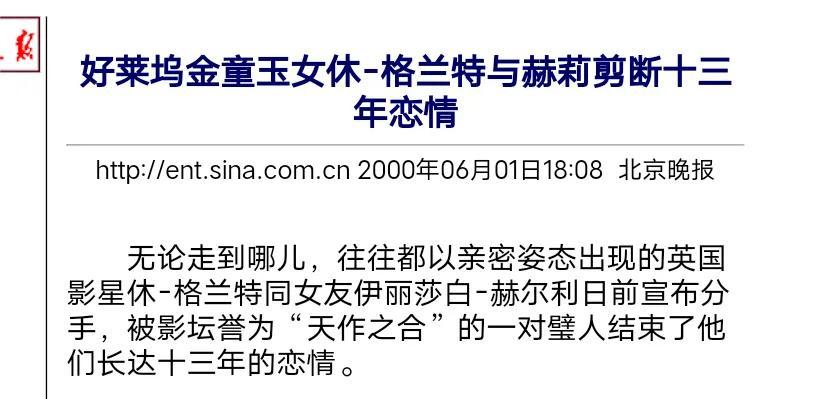那年赫莉30岁,格兰特35岁。但是说不分手的他们却始终不结婚,就这样耗着。1998年赫莉接受采访声称坚决不会与格兰特分手,但是1999年,俩人就被曝出分别有了恋情,直到2000年,他们才正式公布分手。
