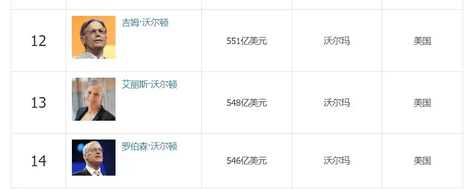 《财富》世界500强排行榜的历史始于1955年,主要依据营业收入对全球公司进行排名,依据这个榜单的数据,人们可以了解全球最大企业的最新发展趋势,但企业是否真的强大,不只是营业收入这个单一维度决定的。比如,以市值和利润来看,京东都与阿里巴巴有较大差距,但在榜单上却排名更靠前,京东102名,阿里巴巴132名,原因是世界500强主要根据上一年的营业收入进行排名,作为零售商角色,京东营收有很大一部分来自京东自营,每卖一件商品都会产生交易流水,会算到京东营业收入里。阿里巴巴则是平台模式,营收主要来自天猫、淘宝收取的服务费以及商家在平台所花的推广费等,商品交易额并不在营收之列。建议大家从多个维度来观察、分析,或者综合多个榜单进行比较。本文分析的沃尔玛则经常出现在各种榜单里,绝对实力:彭博社报道的全球最富有的25个家族中,沃尔顿家族(Waltons)以 1905亿美元排名首位,过去一年的资产增长速度是每分钟上涨7万美元、每小时上涨400万美元、每天上涨1亿美元;福布斯2020富豪榜中,吉姆·沃尔顿,艾丽丝·沃尔顿,罗伯森·沃尔顿以551亿美元,548亿美元,546亿美元的财富分别排名第12,13,14名。