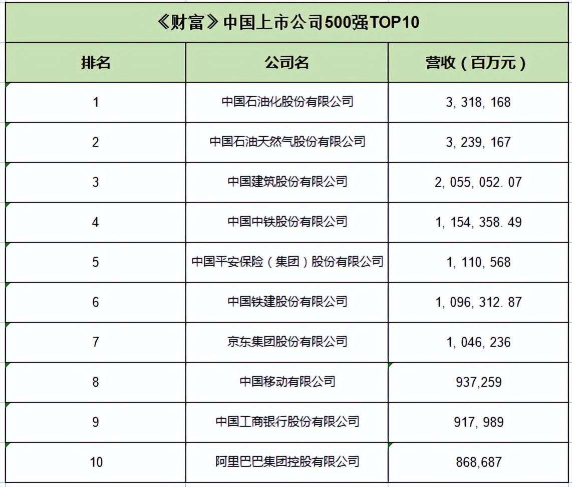 与往年一样,“中字打头”的几家央企依旧位于榜单前列,其中排名前三的上市公司分别为:中石化、中石油和中国建筑。Top10榜单中,足有8家央企上市公司霸榜, 民营上市公司仅有2家,且均是赴美上市的电商集团。