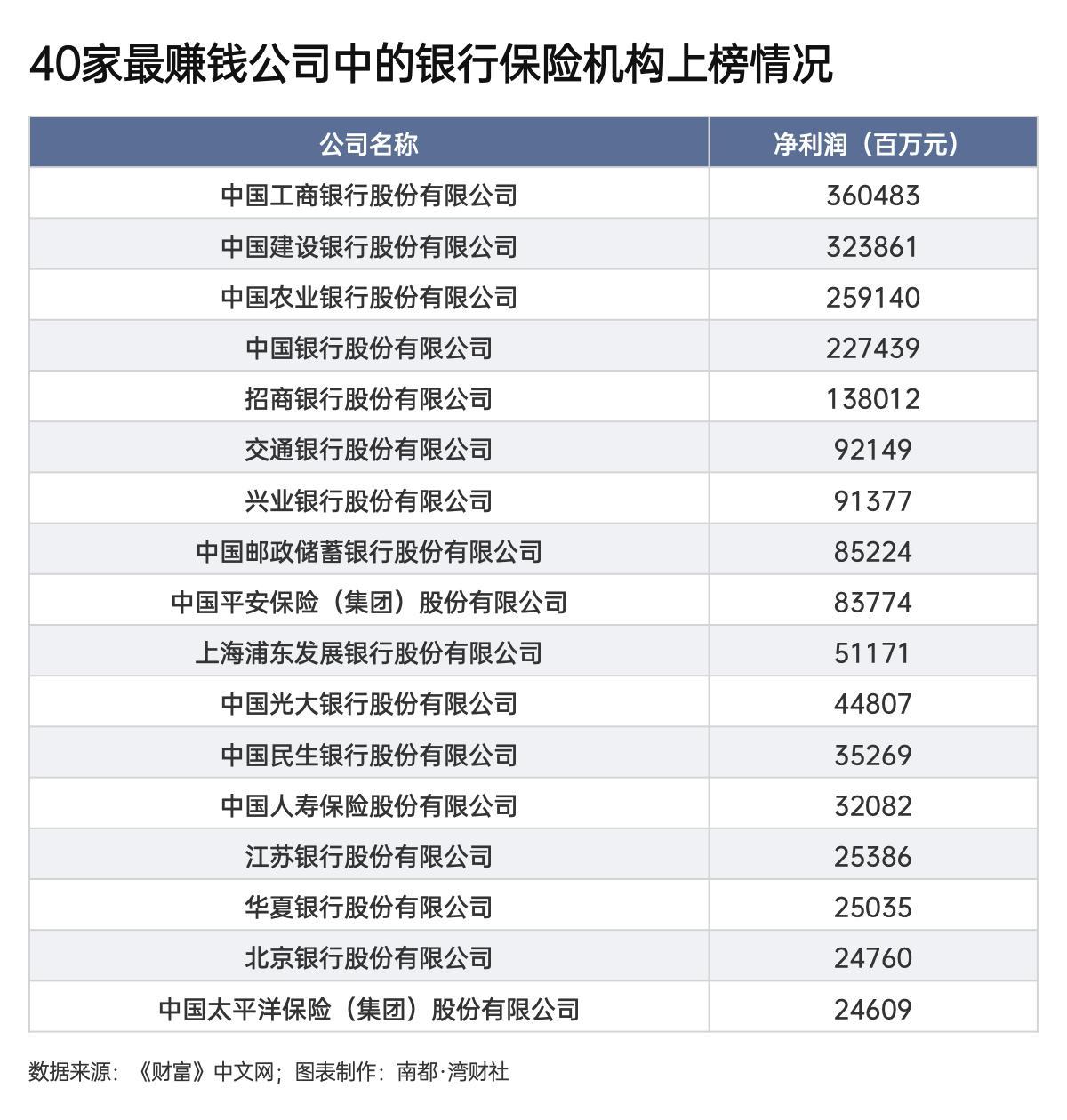 在中国上市公司500强榜单揭晓的同时,最赚钱的40家公司名单也随之公布。据《财富》中文网统计,盈利能力方面,银行保险机构占据40家上榜公司中的17席,包括14家银行和3家保险公司,较上一年多出3家。