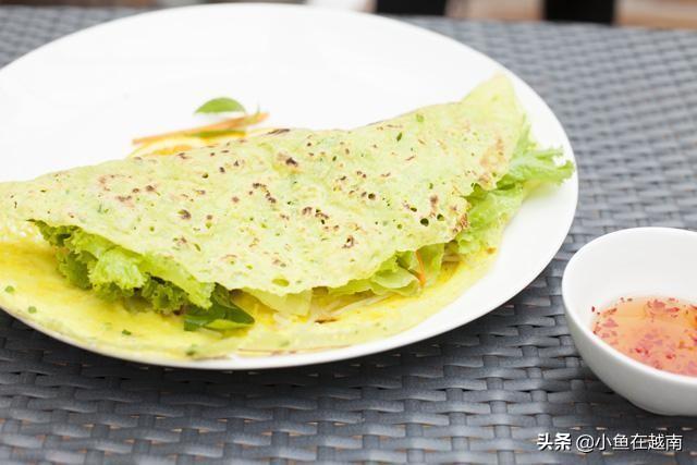 (酥脆的薄煎饼),越南煎饼翻译成“嗞嗞饼”,意指米糊被摊在热锅上时嗞嗞作响的声音。这种可口的薄煎饼的米糊用面团,水和姜黄(用于调色和调味)做成,而且常常加入猪肉,大虾,绿洋葱和豆芽。