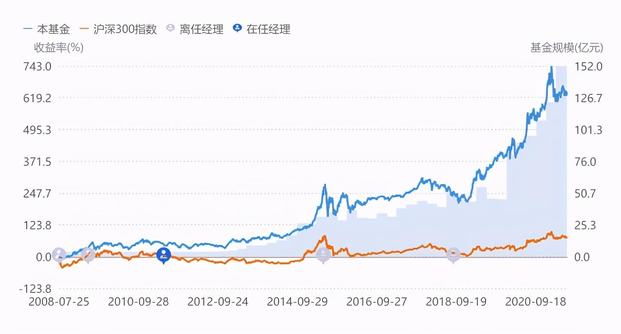 点评:把时间拉长到十年,能一直做到熊市、牛市都跑赢沪深300指数,牛市进攻性强,熊市防御性强,这就叫长跑健将,而产品规模能随着时间一直累积增加,也是颇为难得,不亏是一代“神基”。