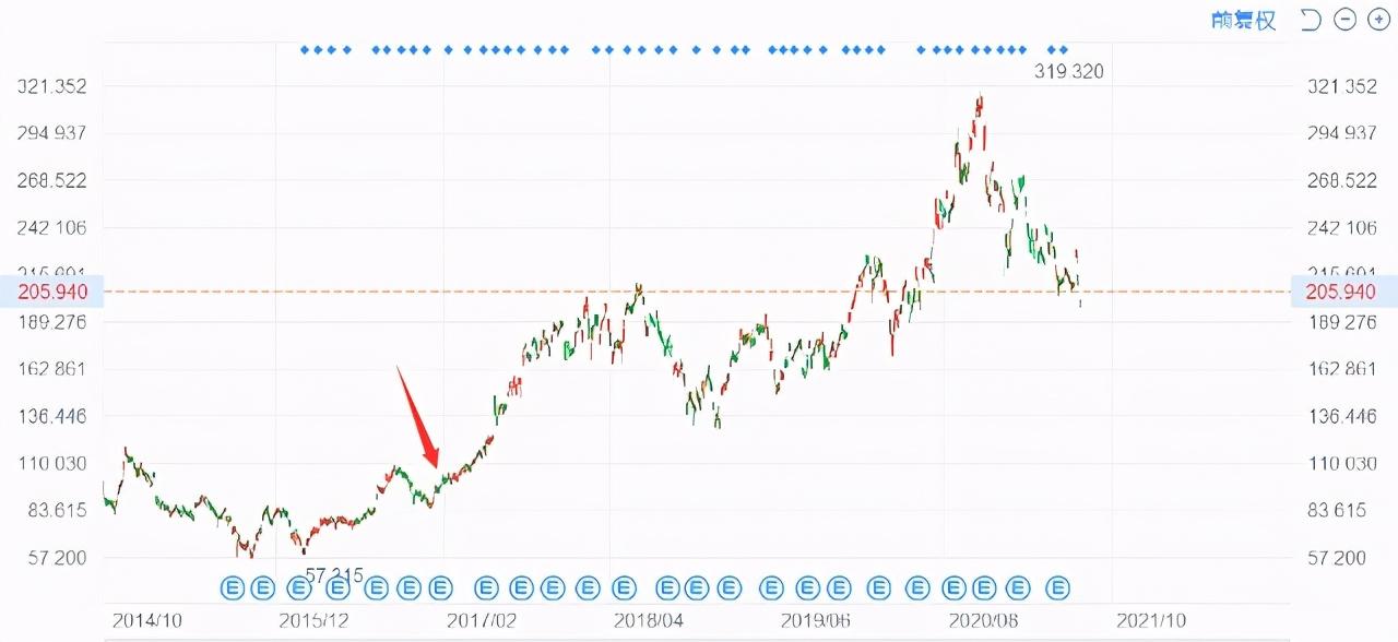 2012年底反腐加上白酒塑化剂风波,茅台股价从220多跌到110多。