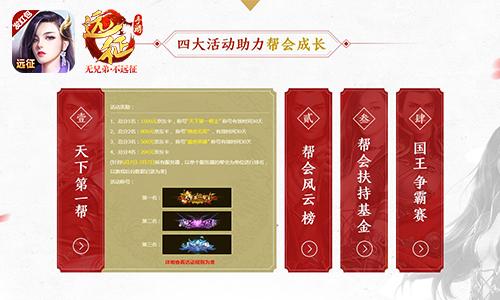 想要在争霸赛中脱颖而出,《远征手游》帮会扶持计划正式上线,四大活动助力帮会成长!从5月23日开始,玩家可前往活动页面创建帮会,领取帮会扶持基金,兄弟齐心发展帮会,打造最强活跃帮,将有海量京东卡及超炫特效称号,见证王者诞生。更有首届国王争霸赛恭迎帝王君临天下,更可额外获得5000元宝及稀有时装奖励,给你名利双收的机会!