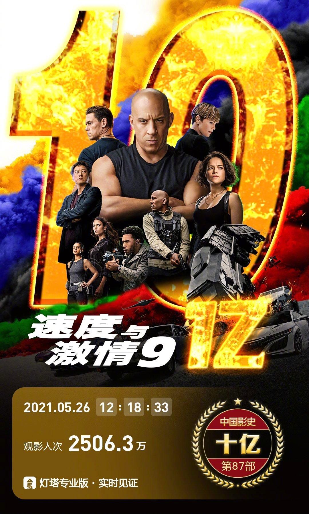昨晚,上映第6天,《速度与激情9》中国内地票房终于破10亿!据统计,这也是中国内地影史上,第87部票房破10亿的影片。此前的系列前作中,《速度与激情8》收获26.7亿内地票房,《速7》24.2亿,番外篇《速度与激情:特别行动》则获得14.3亿。