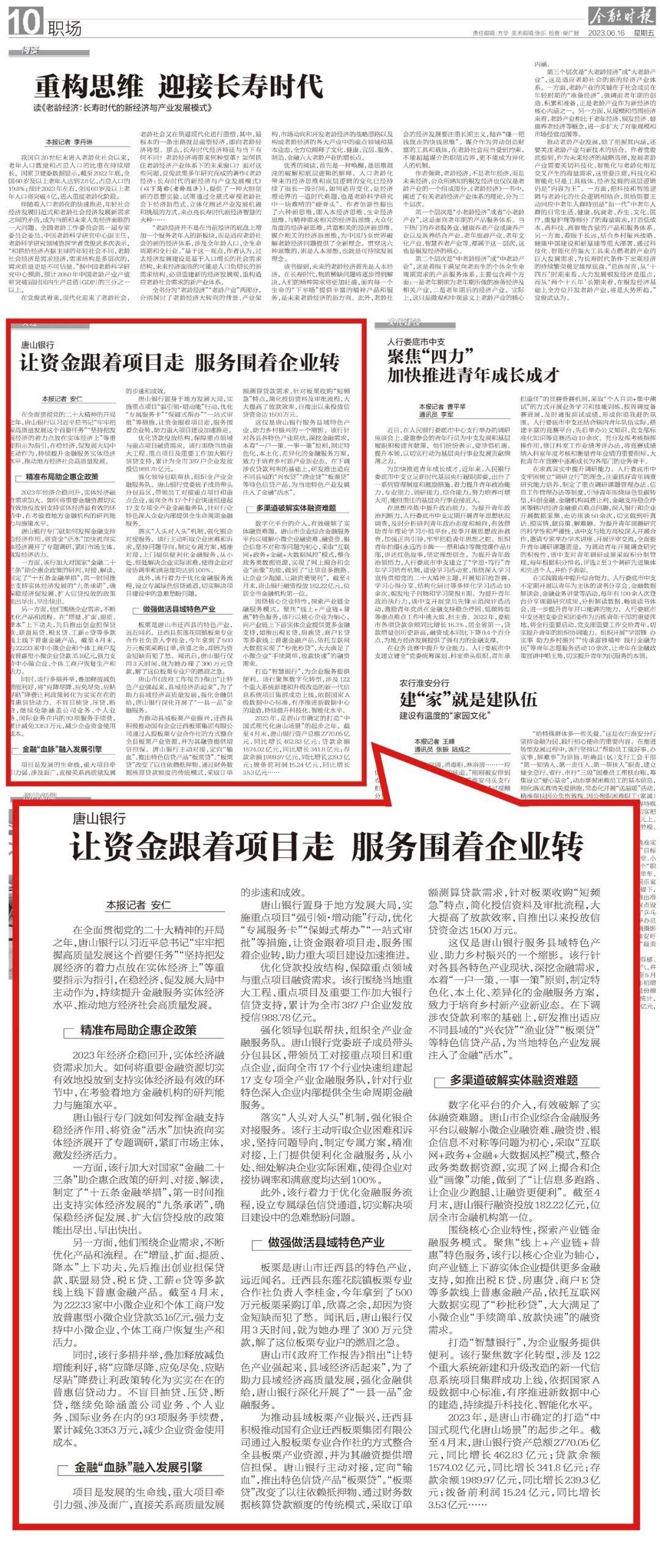 2023年6月16日,《金融时报》记者在深入走访唐山银行实体经济工作氛围、了解唐山银行在稳经济、促发展大局中主动作为的情况后有感而发,刊发了《唐山银行:让资金跟着项目走 服务围着企业转》,对唐山银行持续提升金融服务实体经济水平、推动地方经济社会高质量发展进行深度报道。