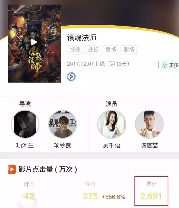但《镇魂法师》上线48小时点击量就突破了1000万,连续三天占据“优酷网络电影日播榜”榜首。