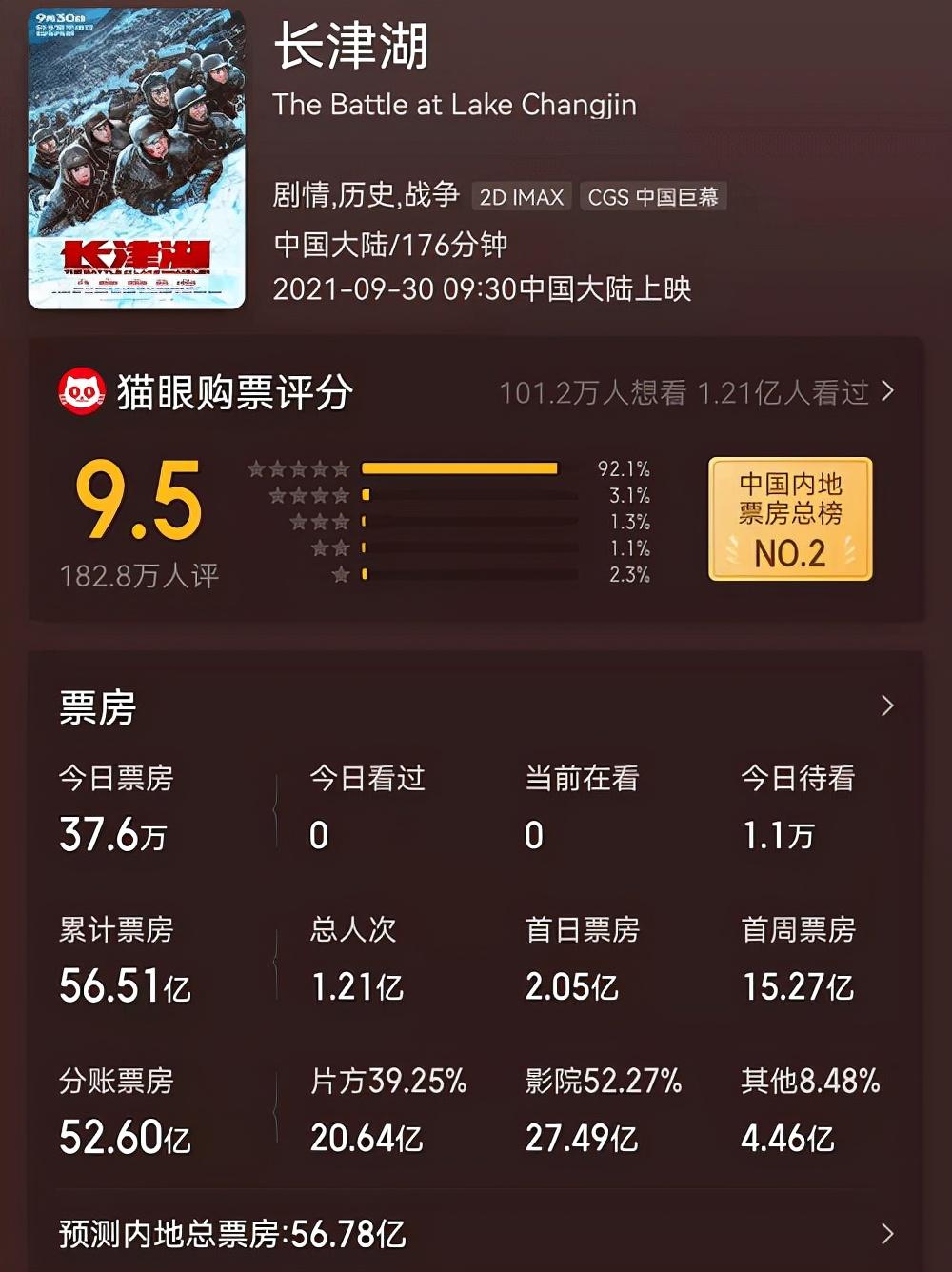 以当下56.51亿元总票房算,《长津湖》除去网络售票平台服务费后的净分账票房52.60亿元,投资方分账约20.64亿元。