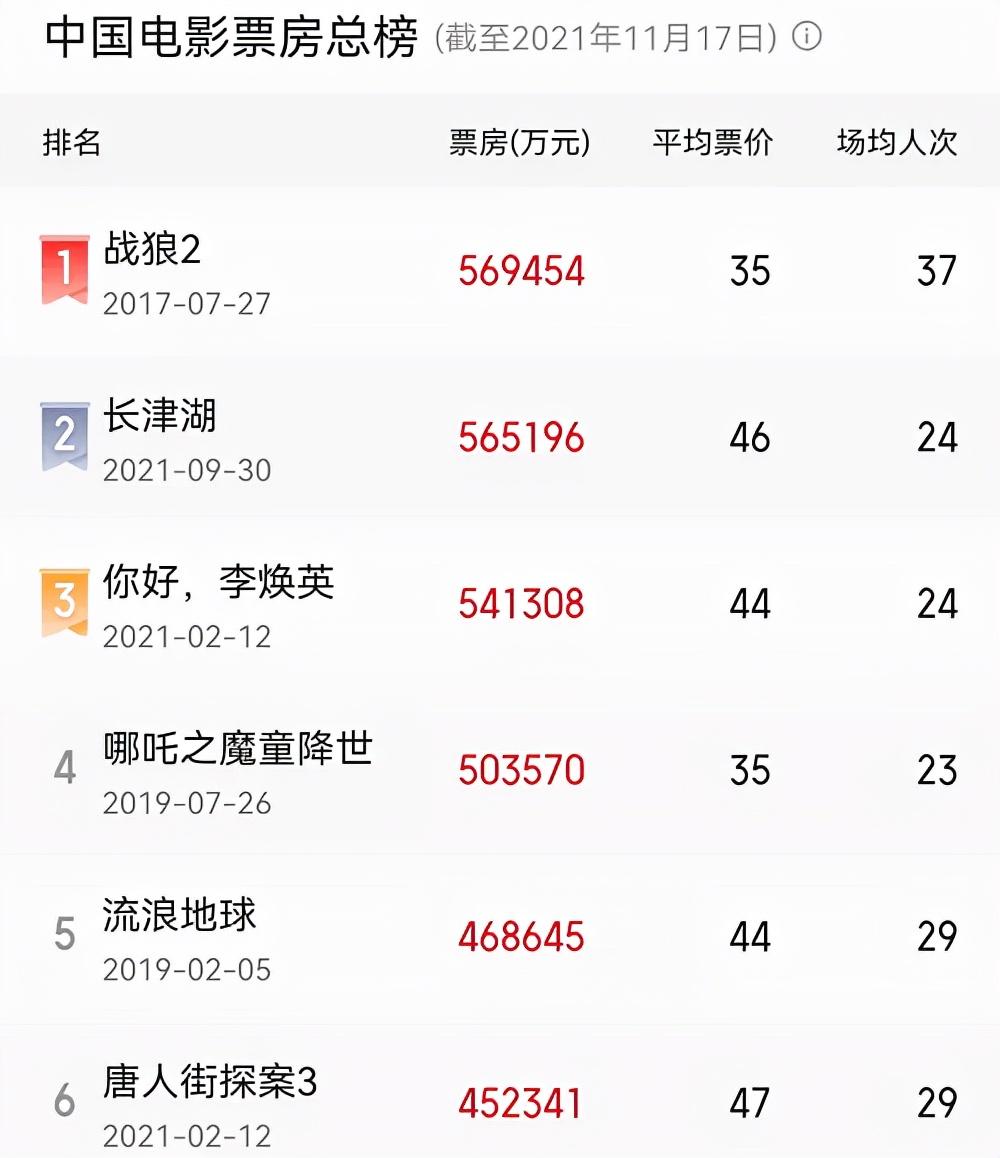 不过,要说明的是,从观影人次看,《长津湖》累计1.21亿,离《战狼2》的1.6亿还有3900万人次的差距。总票房赶超是因为票价高,《长津湖》平均票价46元,《战狼2》平均票价35元;《长津湖》场均人次24,《战狼2》场均人次37。