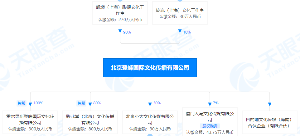 第七大出品方是北京登峰国际。这是演员吴京的公司,由吴燕担任法人,凯燃(上海)影视文化工作室持股90%,旋岚(上海)文化工作室持股10%。凯燃由吴京100%实控,旋岚由吴燕100%实控。据网传消息,吴燕是吴京的姐姐。