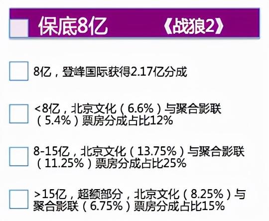 《战狼2》在商业上其实是有“失误”的,可能因为超支压力大(原本预算1.2亿,最后超了8000万,制作成本增加到了2亿),为保险起见,在电影上映前,吴京就提前卖出了发行权,被北京文化以8亿元票房保底,后者凭着这部片一炮而红。