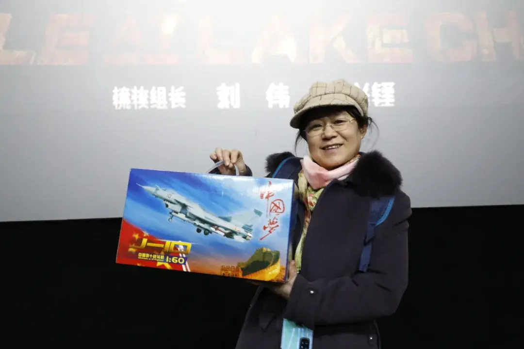 观影后,部分人员合影,赵麟,高毓柠喜获航模。