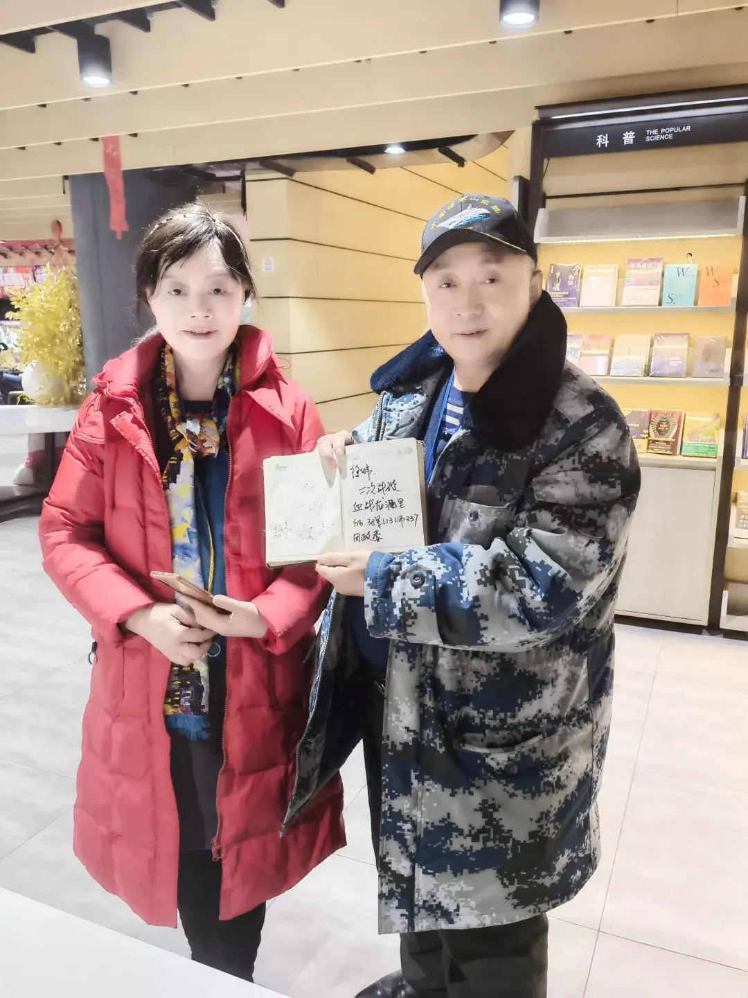 吴志民向中航信托同志赠送《万岁军从硝烟中走来》书。左吴志民,右周媚。