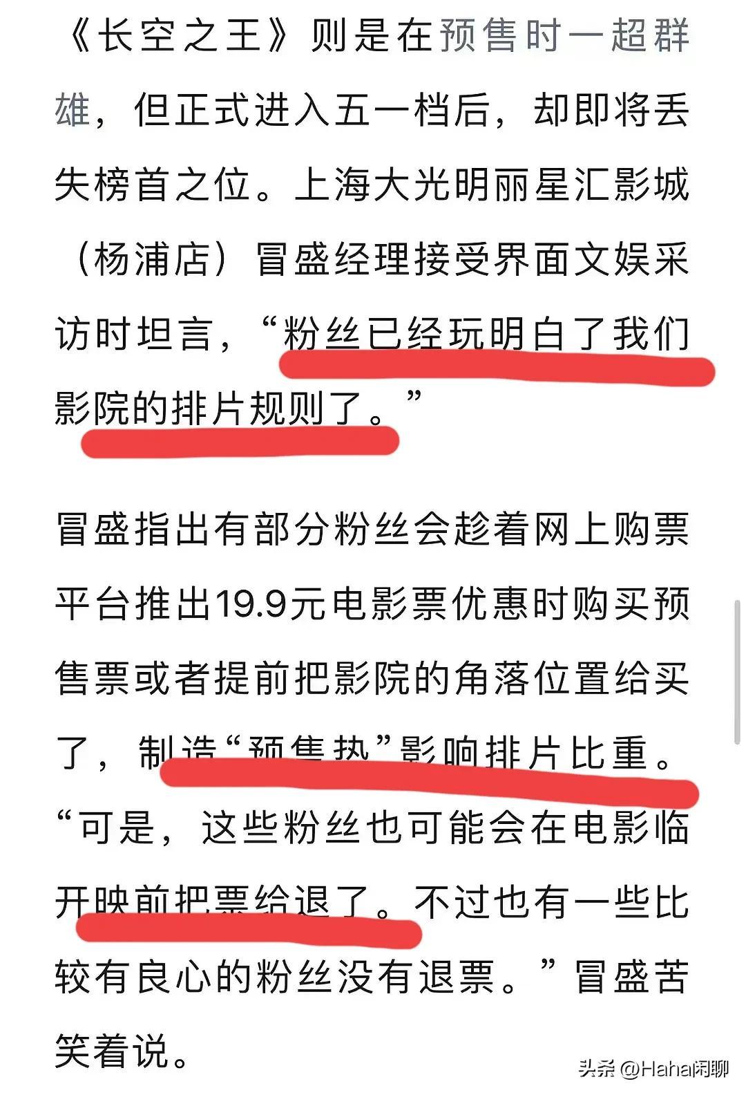 这个时候,影院才明白,之前预售破亿,是因为其中有相当大一部分是王一博的粉丝为了排片冲出的预售成绩。