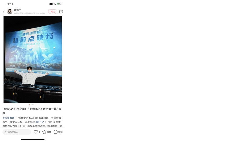 12月14日下午,电影《阿凡达:水之道》“亚洲IMAX激光第一幕”首映活动在东莞万达影城华南MALL店举行,这也是亚洲首家IMAX激光影院。