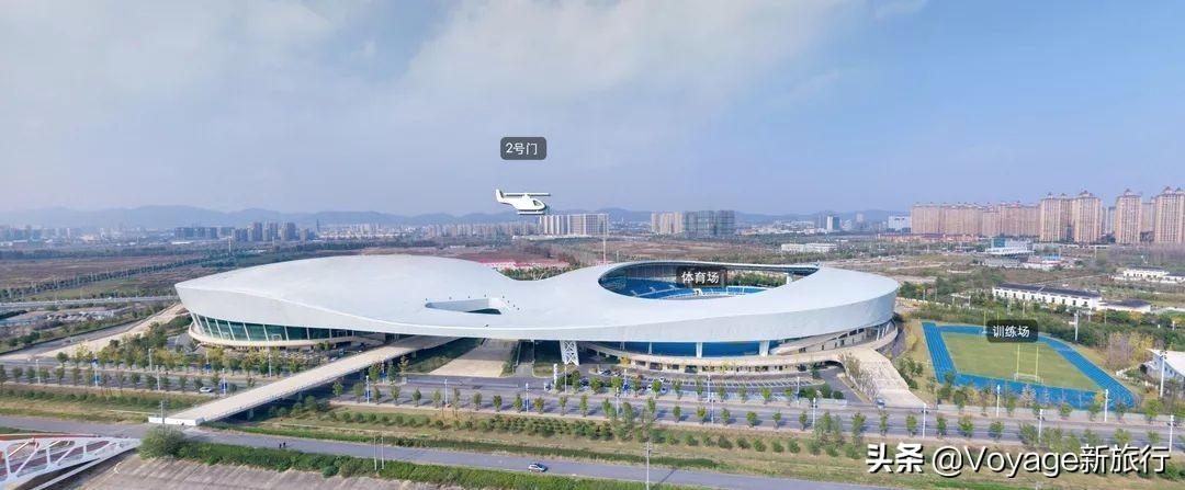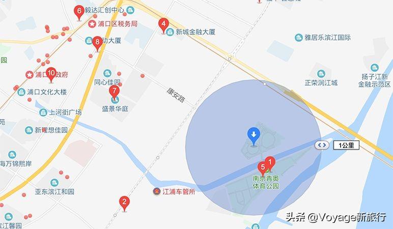 南京青奥体育公园位于南京市浦口区(蓝色箭头),活动所在的南京青奥体育公园体育馆体可以容纳两万人同时观看演出/比赛,是中国最大的室内体育馆。