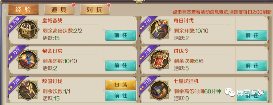 每日讨伐,帮会日常(每日完成10轮打怪任务,即可获得大量经验。)