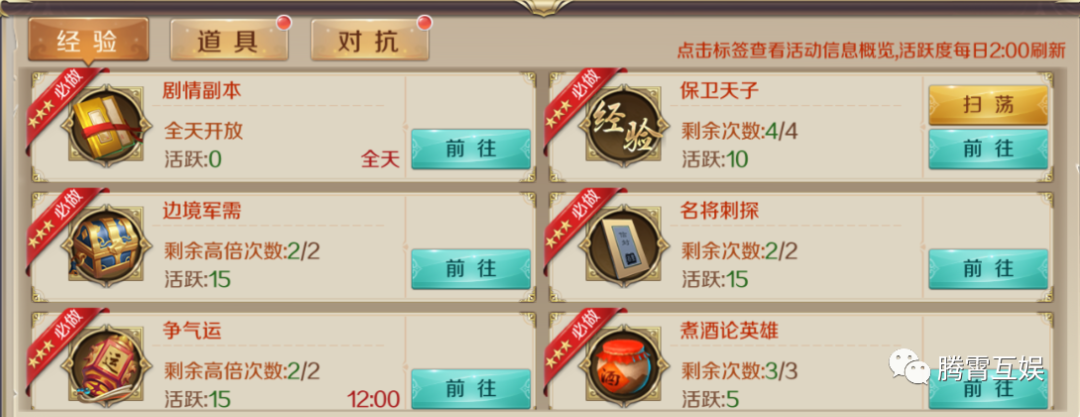 刺探:30级开启,每日主要经验获取途径之一,红色为最高,每天12点~14点,21点至23点为国运时间。刺探可获取超额经验。