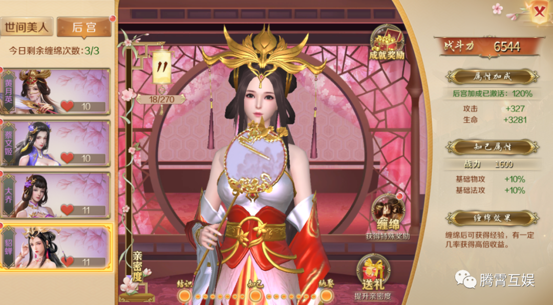 美人:后宫系统里有非常多三国里的美人,里面的人物可以通过完成后宫剧情来与她结识,还可以结识新的人物可以提升相应的战力。如果和人物亲密度达到10级还可以娶入后宫,后宫可以缠绵,缠绵一次可以获得经验值。