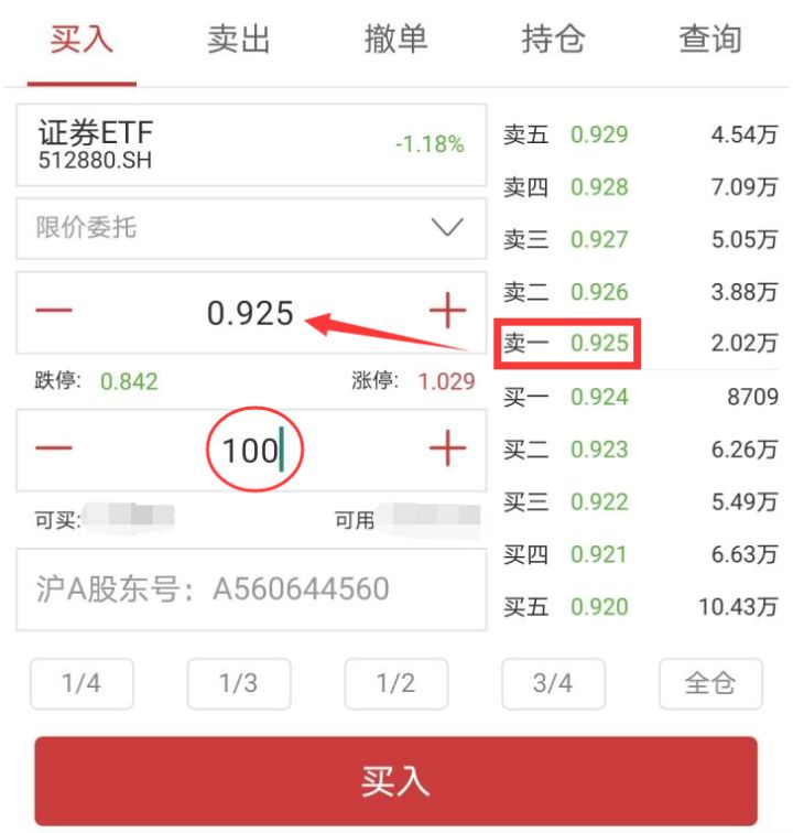 2、点击交易 ->买入,输入100份,买入价格选择卖一价,确定,买入成功